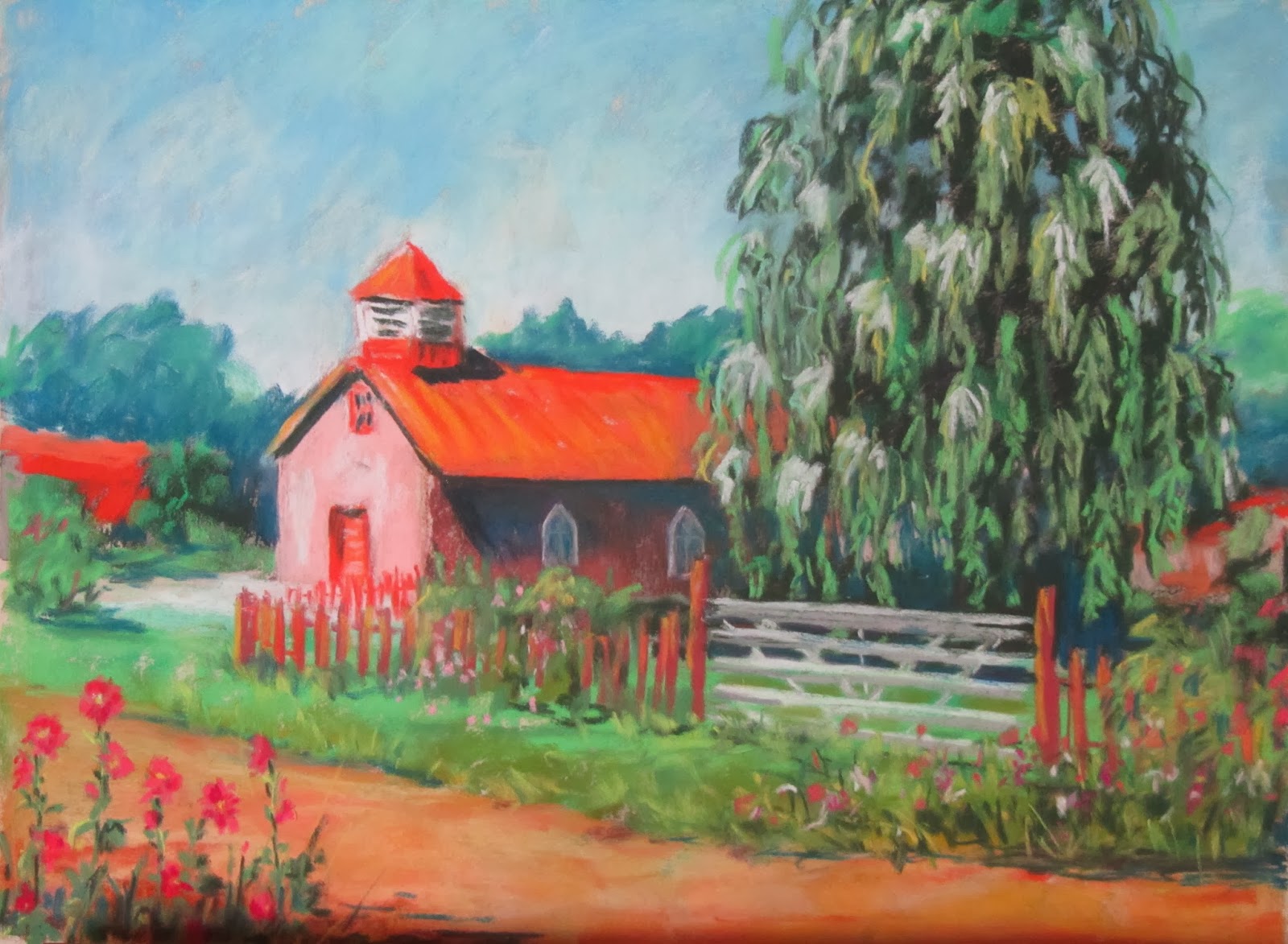 This is a little painting that I have been working on this week. Using a couple of photos that I took years ago in Taos, NM, I put this together. When we lived in NM, we did our grocery shopping in Taos every week. The main drag through town could be very congested during tourist season. So, I often took the back roads around Taos to avoid the traffic around the plaza. This is some little church with a huge willow tree.